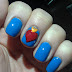 The base color is Sally Hansen Blue Me Away. The red heart was done with Orly Monroe Red. And the fire was done with China Glaze Breakin' and China Glaze Solar Power.